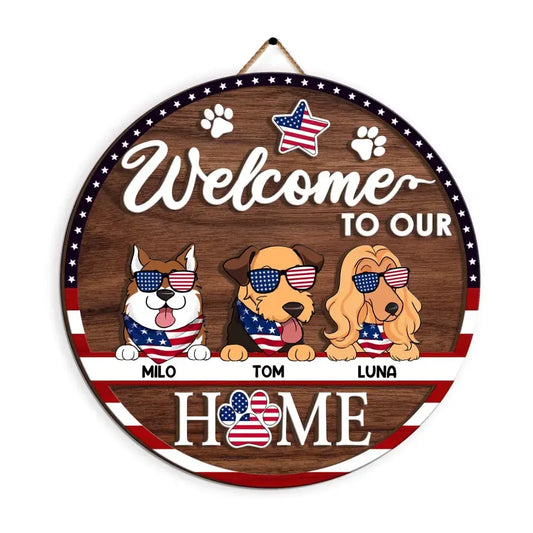 4th of July,Welcome to Our Home - Personalized 2 Layer Sign, American Flag Door Sign, Gift For Pet Lovers