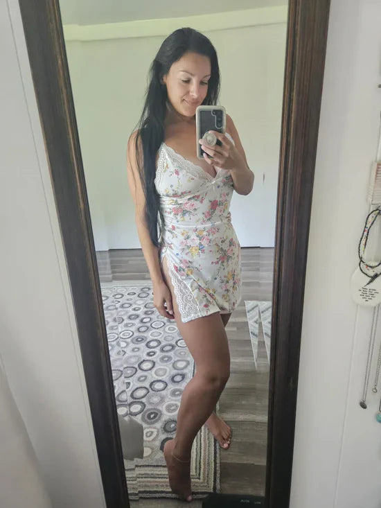 With a seductive deep V-neck, this sleepwear frames your neckline and defines the bust, captivating attention. Graceful side slits subtly reveal your legs, adding a touch of allure. Ideal for relaxing evenings or romantic nights, it amplifies your charm.