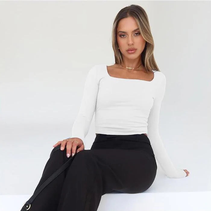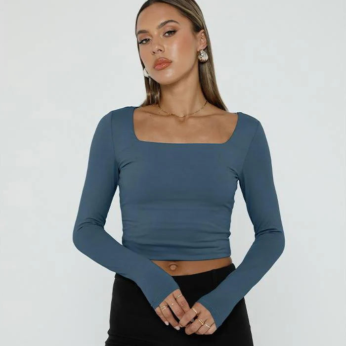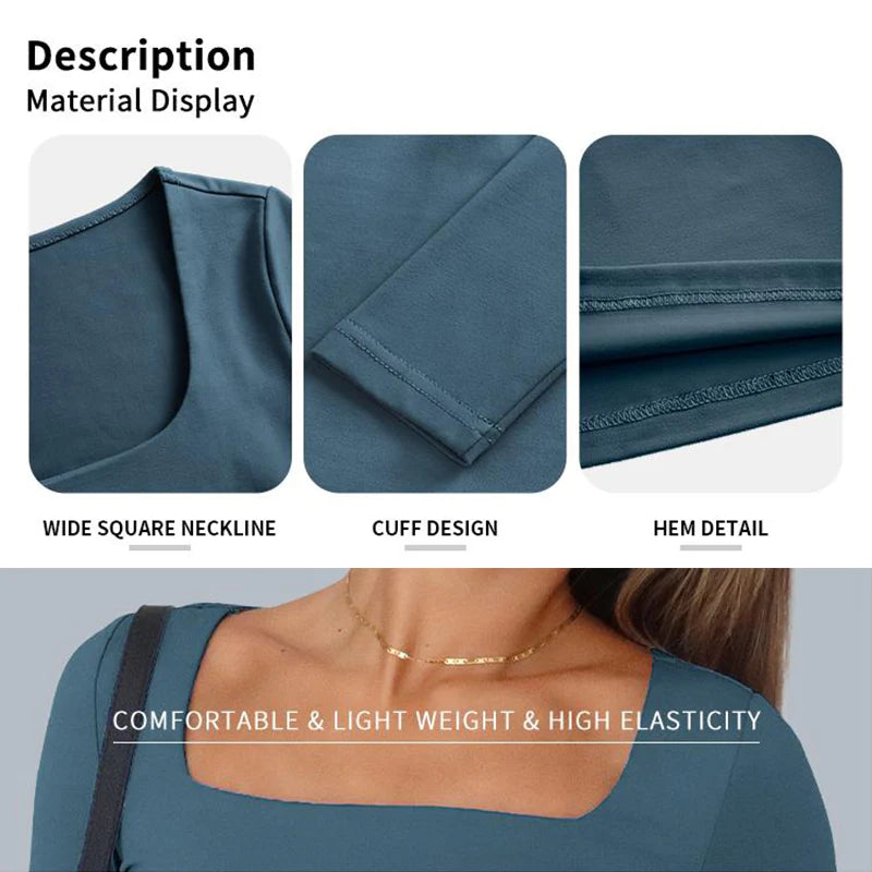 A wide square neckline opens the chest and elongates the neck, giving a feminine, balanced frame that looks great with necklaces or bare for a minimalist look.