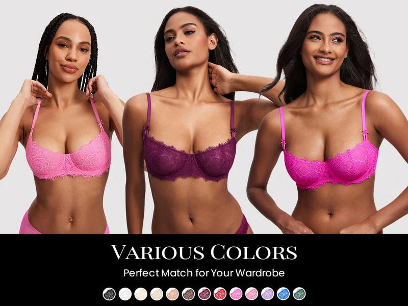 Our lace bra makes you more graceful and enchanting. Perfect to style with low-cut clothing, such as deep v blouses, low-cut square neck tops or dresses. Fabric·94% Polyamide, 6% Elastane Details·Sheer demi cups help to create charming round shapes·Ultra soft lace mesh fabric, breathable and lightweight·The padded inner sling for added lift up·Eyelash lace trims and bows on straps add more femininity·No poke underwire gives enough support even to large breasts·Convertible bras can be worn as criss-cross or basic style.